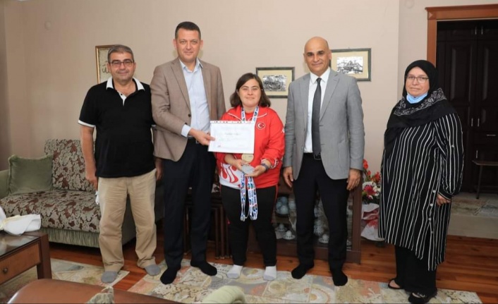Alanya Kaymakamı Dr. Fatih Ürkmezer İtalya'da düzenlenen Down Sendromlular Avrupa Şampiyonası'nda Dünya Rekoru kırarak 4 altın, 4 gümüş madalya kazanan Milli Sporcu Dilara Çelik'i ziyaret etti.