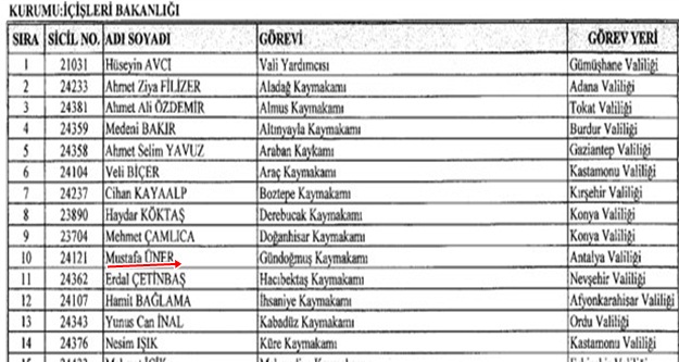 Olağanüstü hal kapsamında hazırlanan 682, 683, 684 ve 685 sayılı 4 yeni Kanun Hükmünde Kararname, Resmi Gazete'de yayımlandı. 367 kişilik iraç listesinde Alanya'nın komşusu Gündoğmuş Kaymakamı Mustafa Üner de bulunuyor. Üner, 25 Kasım'da düzenlenen operasyonla gözaltına alınmış, 23 Aralıkta da adli kontrol şartı ile serbest bırakılmıştı.