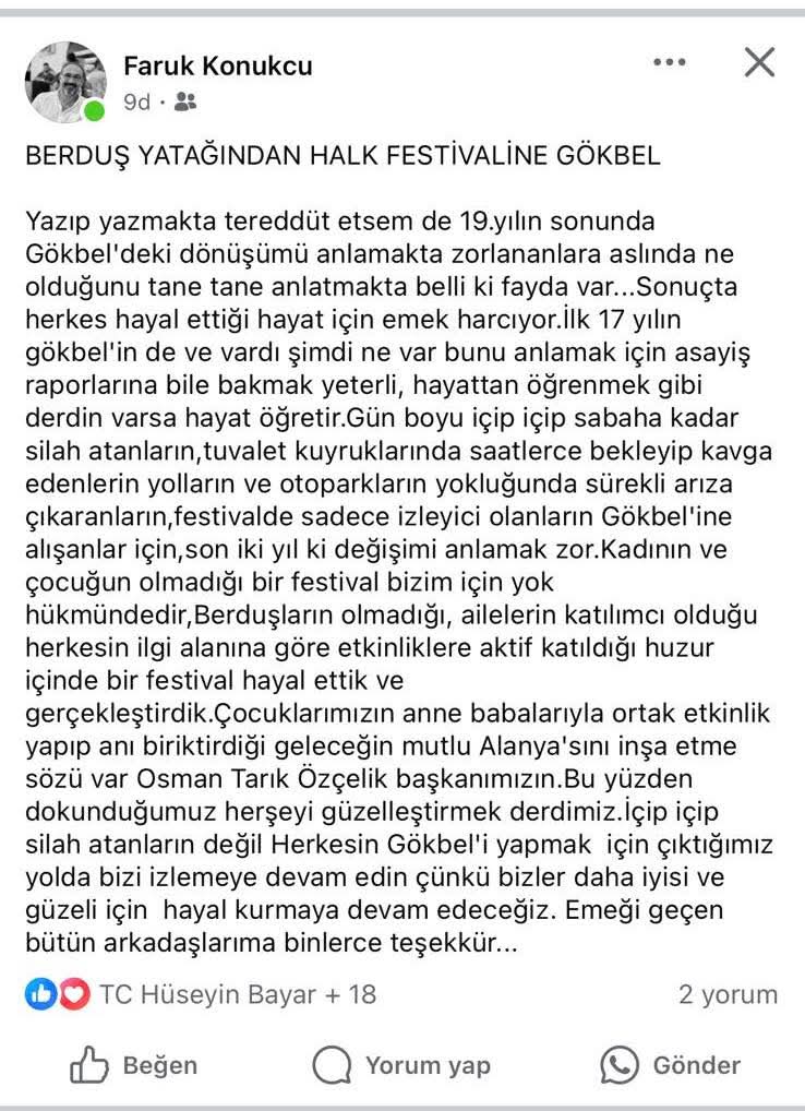 Alanya Belediyesi Başkan Danışmanı Faruk Konukçu'nun sosyal medyada Gökbel'e ilişkin yaptığı paylaşım ortalığı karıştırdı. Gökbel'i “Berduş yatağından halk festivaline döndürdük” diyen Konukçu'ya yorumlar art arda geldi