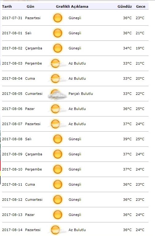 "Bölgemizde halen mevsim normallerinde seyreden hava sıcaklıklarının, 30/07/2017 Pazar gününden itibaren bölge genelinde artarak 02/08/2017 Çarşamba gününe kadar mevsim normallerinin 2 ila 5 derece üzerinde seyredeceği tahmin edilmektedir. Önümüzdeki hafta yüksek hava sıcaklıklarının meydana getirebileceği olumsuzluklara karşı başta yaşlılar, çocuklar ve kronik hastalığı olanlar olmak üzere vatandaşlarımızın güneş ışınlarının dik geldiği 10-16 saatleri arası güneş ışınlarına direk maruz kalmamaları hususunda dikkatli olmaları ve sıcaktan korunmak için gerekli önlemleri almaları önem taşımaktadır."