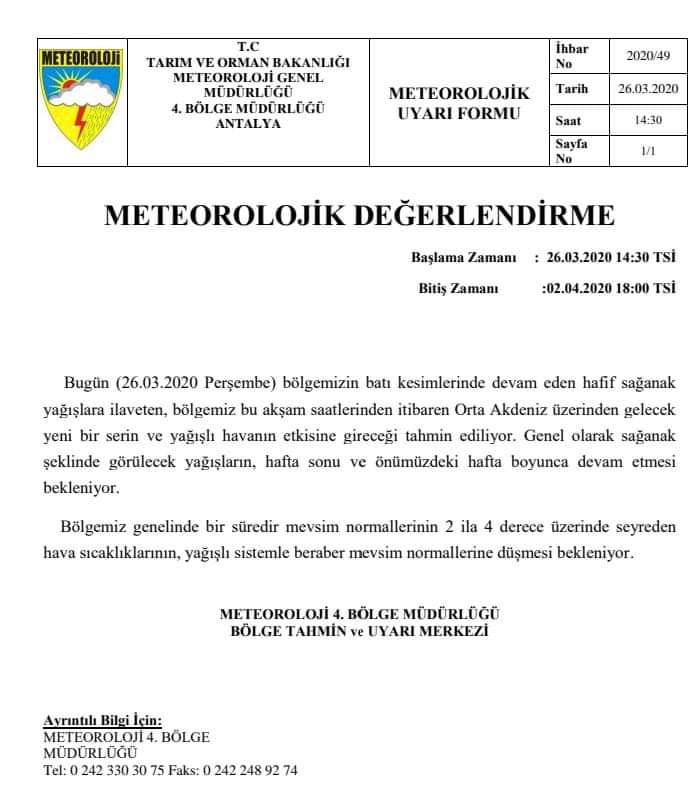 Açıklamada, "Bugün bölgemizin batı kesimlerinde devam eden hafif sağanak yağışlara ilaveten, bölgemiz bu akşam saatlerinden itibaren Orta Akdeniz üzerinden gelecek yeni bir serin ve yağışlı havanın etkisine gireceği tahmin ediliyor. Genel olarak sağanak şeklinde görülecek yağışların, hafta sonu ve önümüzdeki hafta boyunca devam etmesi bekleniyor. Bölgemiz genelinde bir süredir mevsim normallerinin 2 ila 4 derece üzerinde seyreden hava sıcaklıklarının, yağışlı sistemle beraber mevsim normallerine düşmesi bekleniyor" denildi.