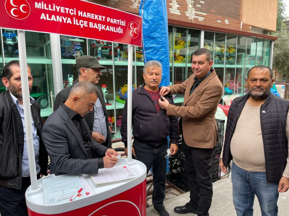 MHP Alanya İlçe Başkanı Mustafa Türkdoğan, Salı Pazarı’nda kurulan stantta, partiye üye olmak isteyenlerin üye kayıtlarını yaparak, parti rozetlerini taktı. Daha sonra Salı Pazarı’nı ziyaret eden Milliyetçi Hareket Partisi Alanya İlçe Başkanı Mustafa Türkdoğan ve yönetimi esnafın sıkıntılarını dinledi. MHP’li ekip alışverişe gelen vatandaşla da bol bol sohbet etme imkanı buldu.