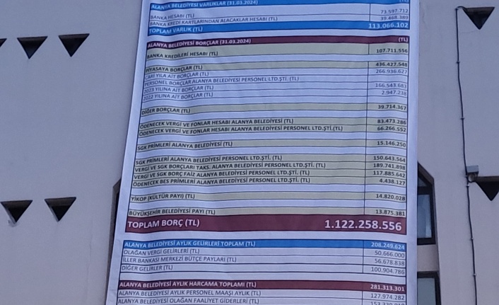 Alanya Belediye Başkanı Osman Tarık Özçelik, 31 Mart Yerel Seçimleri sürecinde vaat olarak borç bakiyesi ve aylık gelir gider dengesini gösteren mali tabloyu göstermişti. Başkan Özçelik, verdiği sözü tutarak belediyenin borç listesini ve aylık gelir gider dengesi afişini ana binaya astı. Asılan listeye göre Alanya Belediyesi’nin kısa vadede ödenmesi gereken toplam borcu 1 milyar 122 milyon 258 bin 556 lira.
