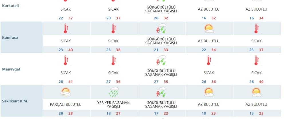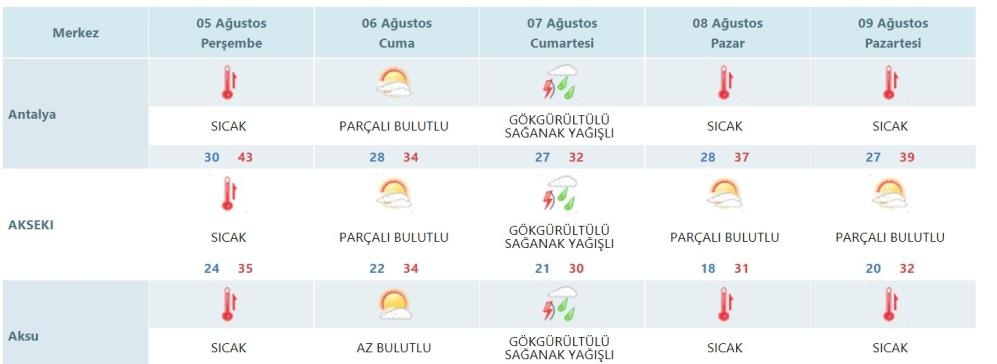 Meteoroloji 4. Bölge Müdürlüğü ise Antalya’da Cumartesi günü gök gürültülü sağanak yağmur beklendiğinin müjdesini paylaştı. Yapılan tahminde Antalya’da hava sıcaklıkları Cuma günü 10 dereceye yakın düşecek. Bugün hava sıcaklık değerleri 43 dereceye kadar çıkarken yağmur beklenen Cumartesi günü 32 dereceye kadar inecek.