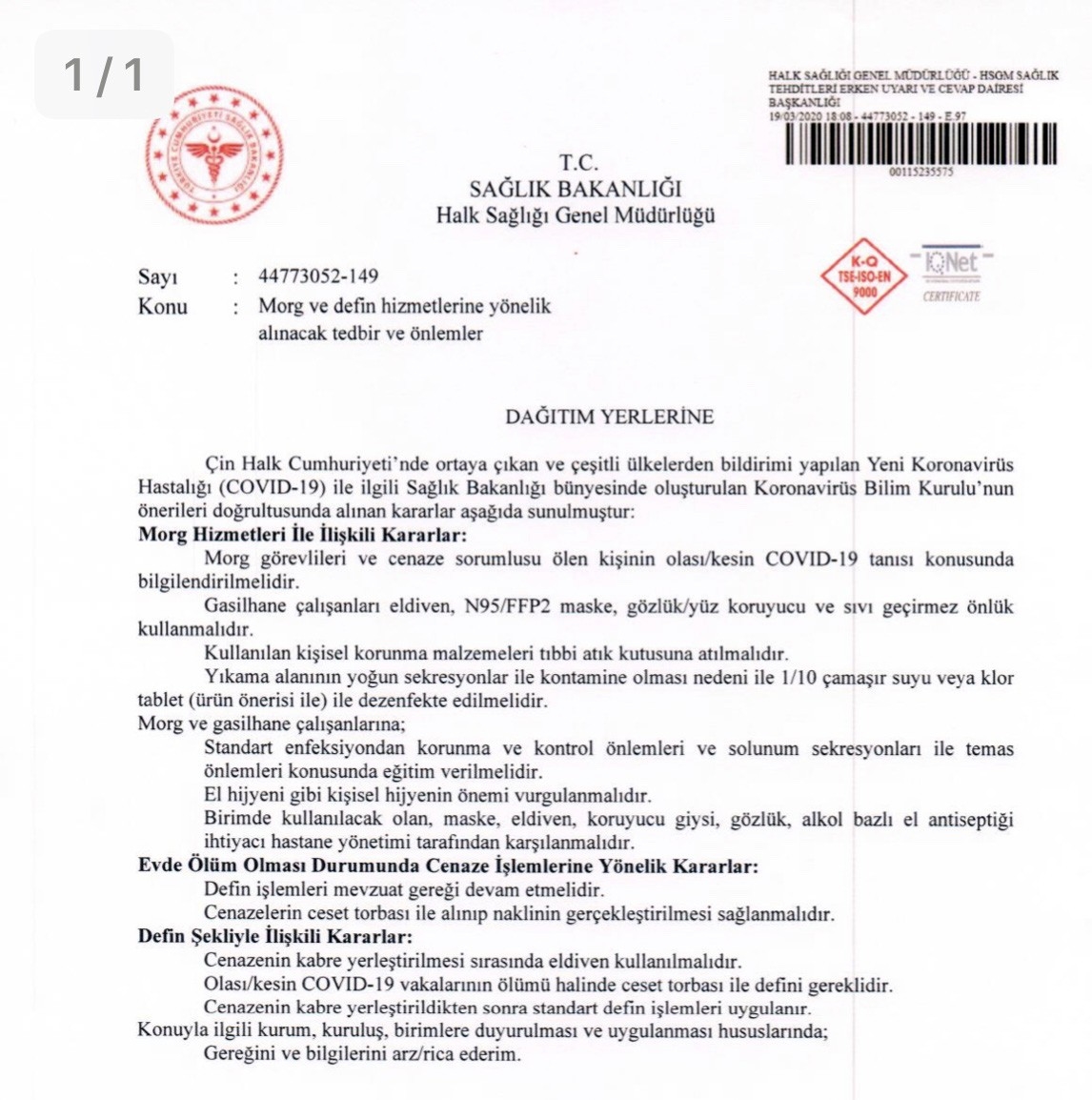 Sağlık Bakanlığı, Çin’de ortaya çıkan ve Tüm dünya için tehdit oluşturan Korona virüs (Covid-19) salgını nedeniyle morg ve defin hizmetlerine yönelik korunma ve kontrol önerilerinde bulundu. Sağlık Bakanlığı Korona virüs Bilim Kurulu tavsiyesi ile morg görevlileri ve cenaze sorumlusu ölen kişinin olası/kesin Covid-19 tanısı konusunda bilgilendirilecek. Önlemler kapsamında gasilhane çalışanları eldiven, N95/FFP2 maske, gözlük/yüz koruyucu ve sıvı geçirmez önlük kullanacak ve kullanım sonrası kişisel korunma malzemeleri tıbbi atık kutusuna atılacak. Yıkama alanlarının yoğun sekresyonlar ile bulaşması nedeniyle bu alanlar 1/10 çamaşır suyu veya kolr tablet ile (ürün önerisiyle) dezenfekte edilecek.