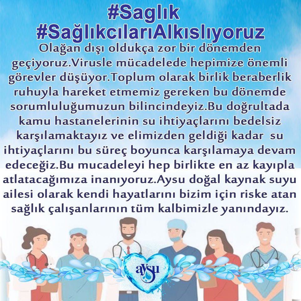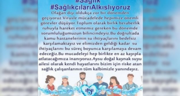 Aysu, sağlık çalışanlarının su ihtiyacını karşılayacağını sosyal medya hesabından duyurdu. ‘Sağlık ve sağlık çalışanlarını alkışlıyoruz’ hastagi ile “Olağan dışı oldukça zor bir dönemden geçiyoruz. Virüsler mücadelede hepimize önemli görevler düşüyor. Toplu olarak birlik beraberlik ruhuyla hareket etmemiz gereken bu dönemde sorumluluğumuzun bilincindeyiz. Bu doğrultuda kamu hastanelerinin su ihtiyaçlarını bedelsiz karşılamaktayız ve elimizden geldiği kadar su ihtiyaçlarını bu süreç boyunca karşılamaya devam edeceğiz. Bu mücadeleyi hep birlikte en az kayıpla atlatacağımıza inanıyoruz. Aysu doğal kaynak suyu ailesi olarak kendi hayatlarını bizim için riske atan sağlık çalışanlarının tüm kalbimizde yanındayız” notu paylaşıldı. Güncelleme Tarihi: 28 Mart 2020, 13:51