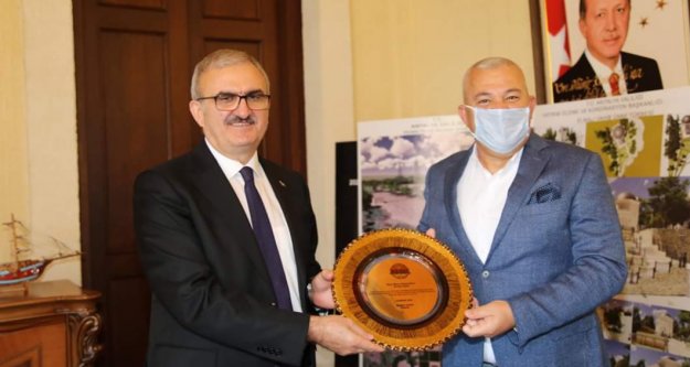 Valilik binasında Vali Karaloğlu’nu ziyaret eden Şahin, “Antalya Valimiz Münir Karaloğlu’nu ziyaret ederek, salgın sürecinde yaptığı başarılı çalışmalar ile bölgemizde toplum sağlığının korunmasındaki üstün gayretleri için teşekkür plaketi takdim ettik.