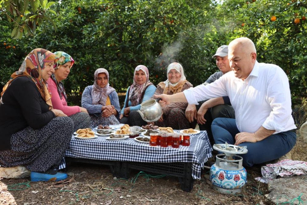 1 Mayıs Emek ve Dayanışma Günü dolayısıyla Alanya Belediye Başkan Adayı Mehmet Şahin, ekibiyle birlikte bahçede portakal toplayan kadın emekçileri ziyaret ederek sofralarına konuk oldu.