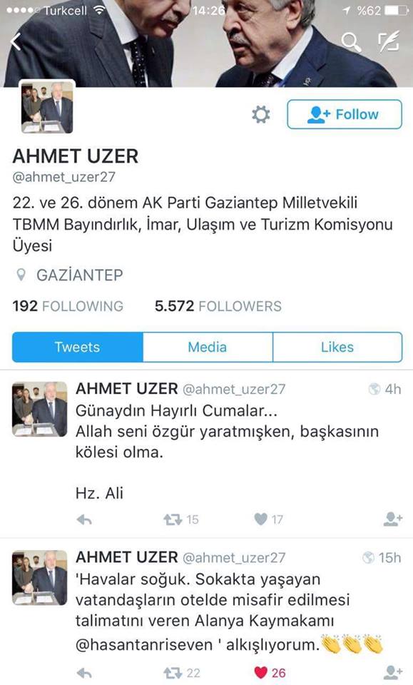 Gaziantep Milletvekili Ahmet Uzer, Twitter hesabında şunları yazdı: "'Havalar soğuk. Sokakta yaşayan vatandaşların otelde misafir edilmesi talimatını veren Alanya Kaymakamı @hasantanriseven'i alkışlıyorum.