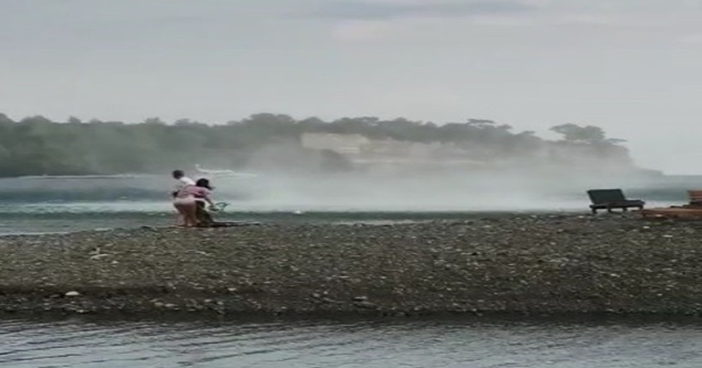 Olay, dün saat 14.30 sıralarında Kemer ilçesine bağlı turizm merkezlerinden Tekirova Mahallesi’ndeki bir koyda meydana geldi. Sahilde yürüyüş yapan bir gurup, denizin üstünde ilerleyen hortumu görünce, hem korktu hem cep telefonuyla görüntülemeye başladı. Hortumun kıyaya yönelmesiyle birlikte yürüyüş gurubu ve sahilin yakın kısmında bulunan iki vatandaş paniğe kapılıp kaçmaya başladı. Görüntüyü çeken vatandaşlar, ‘İlk kez böyle bir şey görüyorum’ diyerek yaşadıklarını anlattı.