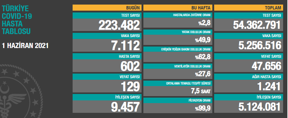 Toplamda 54 milyon 362 bin 791 test yapıldı. Bugün yapılan 223 bin 482 testten, 7 bin 112 yeni vaka sayısı, 602 kişi de yeni hasta sayısı olduğu belirtildi.