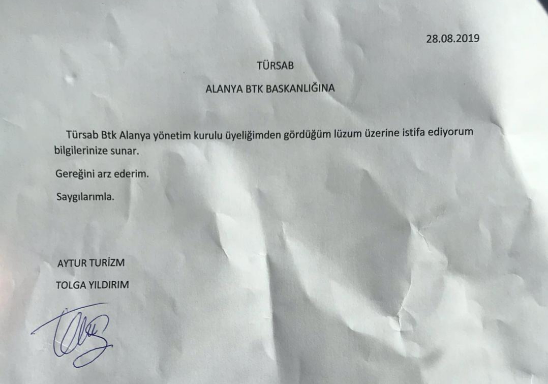 Yıldırım, TÜRSAB Alanya BTK Başkanlığı'na gönderdiği ıslak imzalı dilekçede "TÜRSAB BTK Alanya Yönetim Kurulu Üyeliğimden gördüğüm lüzum üzerine istifa ediyorum. Gereğini arz ederim. Saygılarımla" ifadelerini kullandı. Geçtiğimiz günlerde TÜRSAB Alanya BTK Başkan Yardımcısı Kerim Yılmaz da bu görevinden istifa etmiş ve TÜRSAB Alanya BTK Başkanlığı'na adaylığını açıklamıştı.