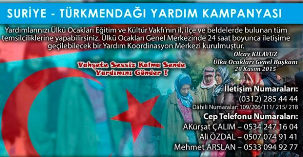 Yardımlarınızı 30 Kasım 2015 tarihine kadar Ülkü Ocaklarının il ve ilçe temsilciliklerine ulaştırabilirsiniz.Ayrıca Ülkü Ocaklar Eğitim ve Kültür Vakfı Türkmeneli Yardım Hesabına (Ziraat Bankası Ankara – Ulus Heykel Şubesi Türk Lirası: ₺ TR 8800 0100 1233 451817305008) yatıracağınız nakdî yardımlar geçmişte olduğu gibi yine bizzat Ülkü Ocakları tarafından ihtiyaç sahibi soydaşlarımıza ulaştırılacaktır.