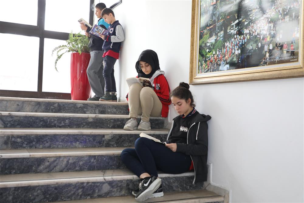 Alanya Mehmet Akif Ersoy Orta Okulu ‘Okudukça Güzelleşir Alanya’m’ Projesi kapsamında Alanya Belediye Binası’nda kitap okudu.
