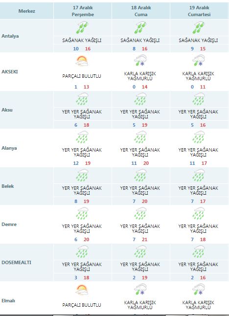 Meteoroloji Antalya 4’üncü Bölge Müdürlüğü’nün verilerine göre, 17 Aralık Perşembe (bugün) gününden itibaren 3 gün boyunca Antalya'da sağanak yağış, Akseki, Elmalı, Gündoğmuş, İbradı ve Korkuteli İlçelerinde karla karışık yağmur bekleniyor. Yağışların Antalya merkez ve tüm ilçelerinde 2 gün boyunca etkili olması beklenirken, hava sıcaklıkları ise sıfırın altında 4 ila 16 derece arasında değişecek.