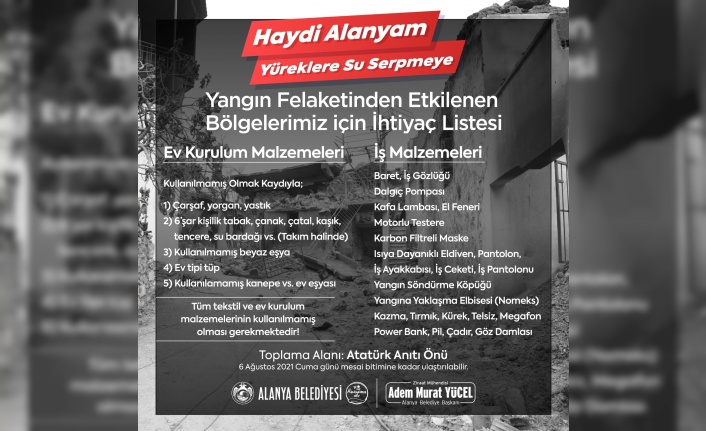 Alanya Belediyesi Sosyal Yardım İşleri Müdürlüğü, yangın afetinin etkili olduğu Alanya’da ve komşu ilçeler Manavgat Gündoğmuş ve Akseki'de yaraları sarmak için çalışmalarına başladı. Çalışmalar kapsamında Alanya Belediyesi tarafından yardım kampanyası düzenleniyor. 6 Ağustos Cuma günü mesai bitimine kadar Atatürk Anıtı önünde kurulan Yardım Çadırı’nda destek olmak isteyen vatandaşların yardımları toplanacak ve afet bölgesine ulaştırılacak.