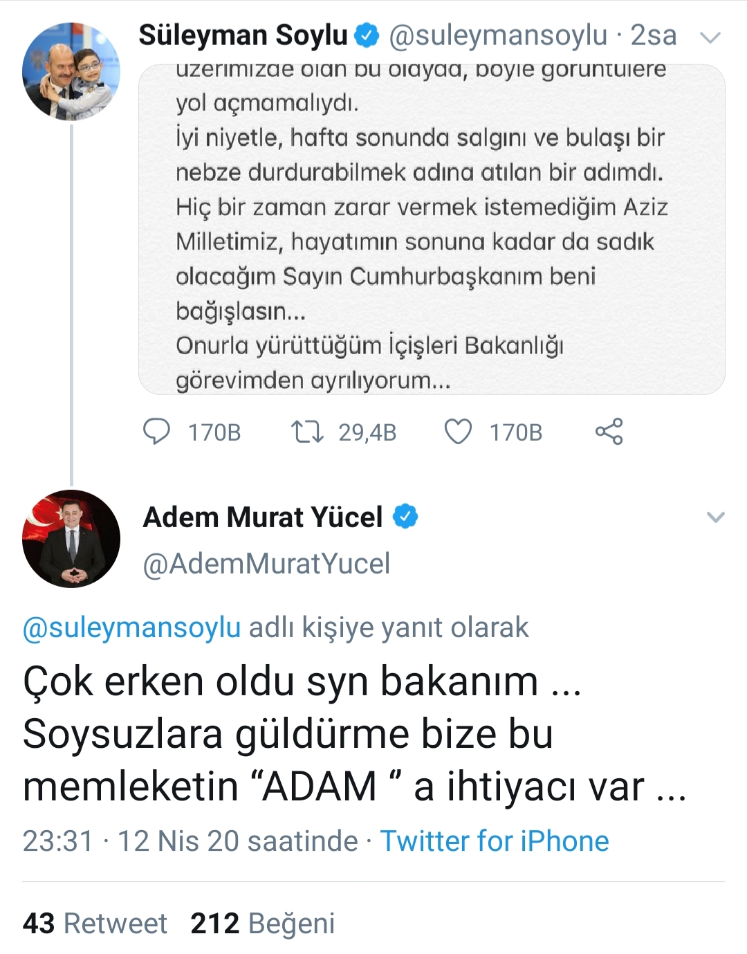 Bakan Soylu'nun Demokrat Parti genel başkanı olduğu süreçte Demokrat Parti'den Kestel Belediye Başkanı seçilen Yücel'le Soylu arasında 15 yıl öncesine dayanan köklü bir dostluk var. Son yerel seçimlerde de Yücel'in seçim kampanyasına Alanya Mahmutlar'da yaptığı mitingle destek vermişti. Bakan Soylu’nun istifa edeceğini açıklamasını ardından Alanya Belediye Başkanı Adem Murat Yücel sosyal medya hesabından, “Çok erken oldu sayın Bakanım. Soysuzları güldürme bize. Bu memleketin adama çok ihtiyacı var” paylaşımında bulundu. Başkan Yücel’in eşi Yıldız Yücel ise, “Bakanım bizleri bırakıp gidemezsiniz . Bir hata yaptıysak bizler yaptık. Bizler sizden özür dileriz.” şeklinde paylaşım yaparak Süleyman Soylu’ya destek oldu.