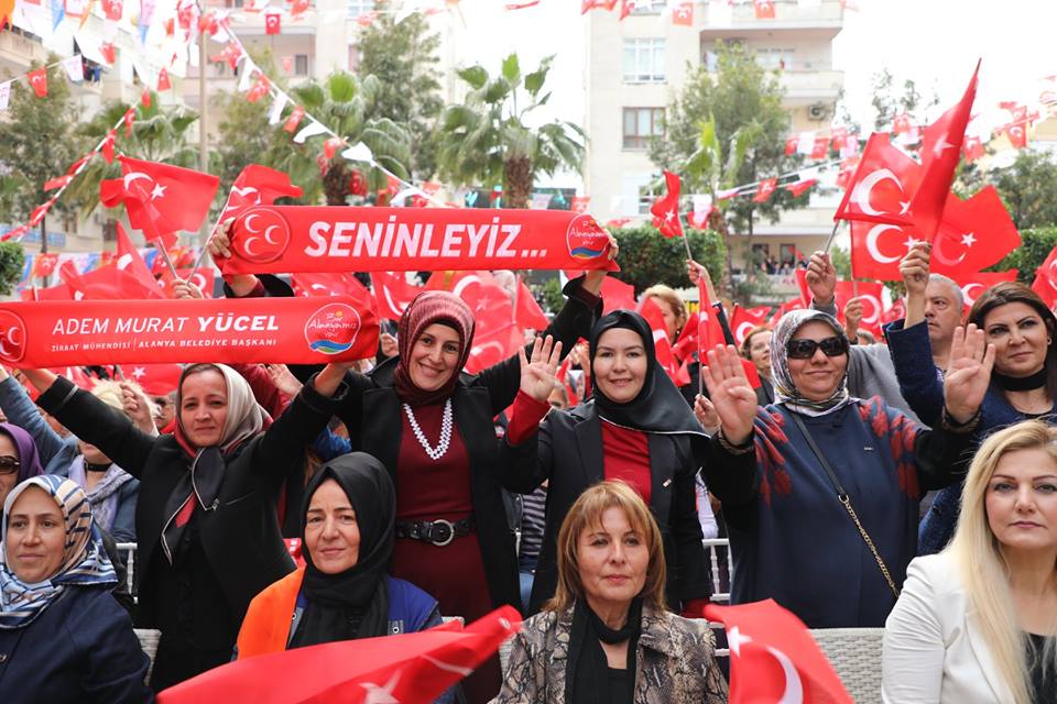 Cumhur İttifakı kapsamında Adalet ve Kalkınma Partisi (Ak Parti) ile Milliyetçi Hareket Partisi’nin (MHP) Alanya’daki ittifak adayı MHP’li Adem Murat Yücel’in 31 Mart Yerel Seçimleri için kullanacağı Saray Mahallesi Yunus Emre Caddesi’nde bulunan Seçim Koordinasyon Merkezi, MHP Merkez Karar Yürütme Kurulu (MKYK) Üyesi Özgür Bayraktar, MHP Antalya İl Başkanı Mustafa Aksoy, Antalya Ülkü Ocakları İl Başkanı Alperen Tuğrul Küreşoğlu, Ak Parti Alanya İlçe Başkanı Mustafa Toklu, MHP Alanya İlçe Başkanı Mustafa Türkdoğan, MHP Antalya eski Milletvekilleri Mehmet Günal ve Hüseyin Yıldız, oda ve dernek başkanları ile MHP ve Ak Parti’ye gönül vermiş binlerce vatandaşın yağmura rağmen katılımıyla açıldı. Açılış töreninde katılımcılara hitap eden Alanya Belediye Başkanı Adem Murat Yücel, 31 Mart’ta Alanya Belediyesini MHP’nin hizmet belediyeciliği ile Ak Parti’nin gönül belediyeciliği anlayışını birleştirerek yöneteceklerini söyledi.