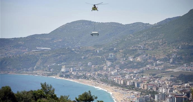 Alanya'da yapımı devam eden teleferik projesi için bugün helikopterler devreye girdi.