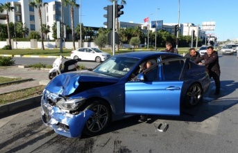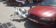 Otomobilin çarptığı motosikletli kask sayesinde kazayı ucuz atlattı
