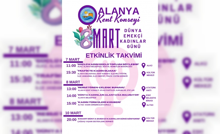 Alanya Kent Konseyi Başkanı Nurhan Özcan, etkinlikler kapsamında yaptığı açıklamada, "8 Mart, bir kutlama günü değil, anma ve aynı zamanda kadın hakları mücadelesinin, emekçi kadınların haklarının ve toplumsal cinsiyet eşitliği konusundaki farkındalığın artırılması için önemli bir gündür. Kadınların toplumsal yaşamın her alanında güçlenmesini ve daha görünür olmasını sağlamak için tüm kurumlarla iş birliği içinde bu programı hazırladık. Tüm halkımızı etkinliklerimize katılarak kadın dayanışmasına destek olmaya davet ediyoruz" dedi.