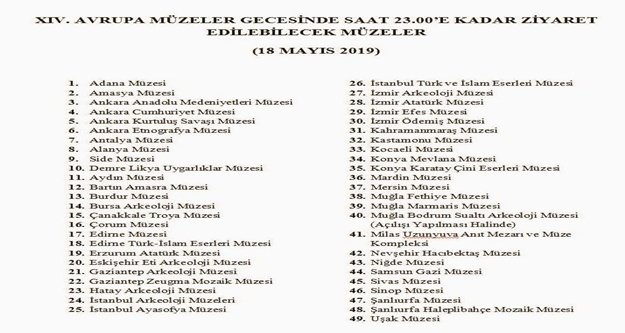 18 Mayıs 2019 Avrupa Müzeler Gecesi’nde Türkiye çapında geceye kadar açık olan müzeler şunlar: