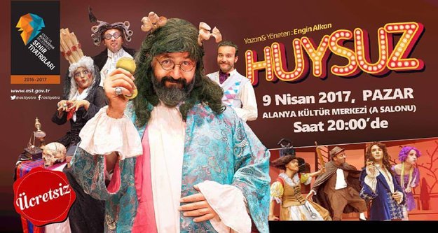 Antalya Büyükşehir Belediyesi Şehir Tiyatrosu Mehmet ÖZGÜR'ün de oynadığı 'huysuz' bu akşam saat 20.00'de Alanya AKM'de A salonunda.