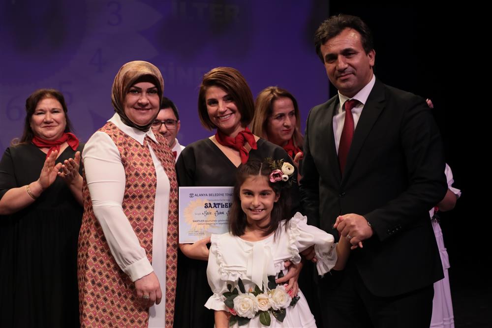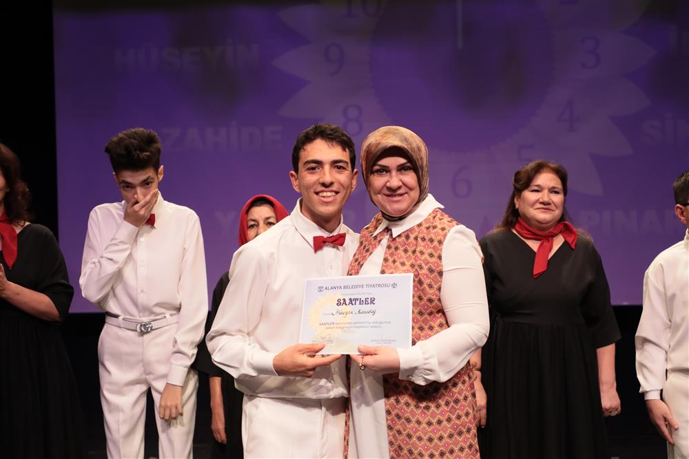 Alanya Belediye Tiyatrosu Çocuk Birimi tarafından 3 Aralık Dünya Engelliler Günü için özel bir gösteri hazırlandı. 11 özel çocuk ve 11 velinin rol aldığı “Saatler” adlı yeni gösteri, 3 Aralık saat 16.00’da Kültür Merkezi Belediye Tiyatrosu A Salonu’nda ilk kez sahnelendi. Geçtiğimiz sezonun ödüllü çocuk oyunu “Kalbimin Sevgili Gözü” ile başlayan programı, Alanya Kaymakamı Dr. Fatih Ürkmezer, Alanya Belediye Başkanı Adem Murat Yücel ve Eşi Yıldız Yücel, İlçe Milli Eğitim Müdürü Yusuf Yılmaz, özel çocukların yakınları, öğrenciler ve vatandaşlar izledi.