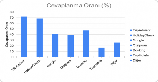 Akdeniz bölgesindeki otellere gelen toplam yorum sayısı yaklaşık 850.000 ile bir önceki yıl ile neredeyse aynı seviyelerde kaldı. Yorum yanıtlama oranı ise yüzde 5'lik artışla yüzde 50'nin biraz üzerinde gerçekleşti. Yorum cevaplama oranı istatistiklerini aşağıya çeken en önemli platform ise Google oldu. Toplam yorum sayısının neredeyse yüzde 40'ına ulaşan Google yorumlarının sadece yüzde 41'i oteller tarafından yanıtlandı. Otellerin TripAdvisor ve HolidayCheck platformlarına gelen yorumları ise yüzde 70 ve üzerinde oranlarla yanıtladıkları görüldü.