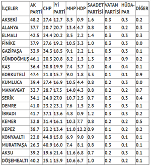 16 ilçede rakiplerine üstünlük sağlayan Ak Parti, en fazla oy oranını Korkuteli'nde elde etti. Korkuteli'nde yüzde 47,5 oy alan Ak Parti'yi yüzde 21,7 oy oranı olan CHP takip etti. Ak Parti, bu ilçede rakibine 25.8 oranında fark attı. Ak Parti'nin en fazla oy aldığı ikinci ilçe ise Gündoğmuş oldu. Gündoğmuş'ta yüzde 46,1 oranında oy alan Ak Parti, bu ilçede ikinci sırada yer alan rakibi İYİ Parti'ye 25.3 oranında fark attı. İYİ Parti Gündoğmuş'ta 20.8 oranında oy aldı.