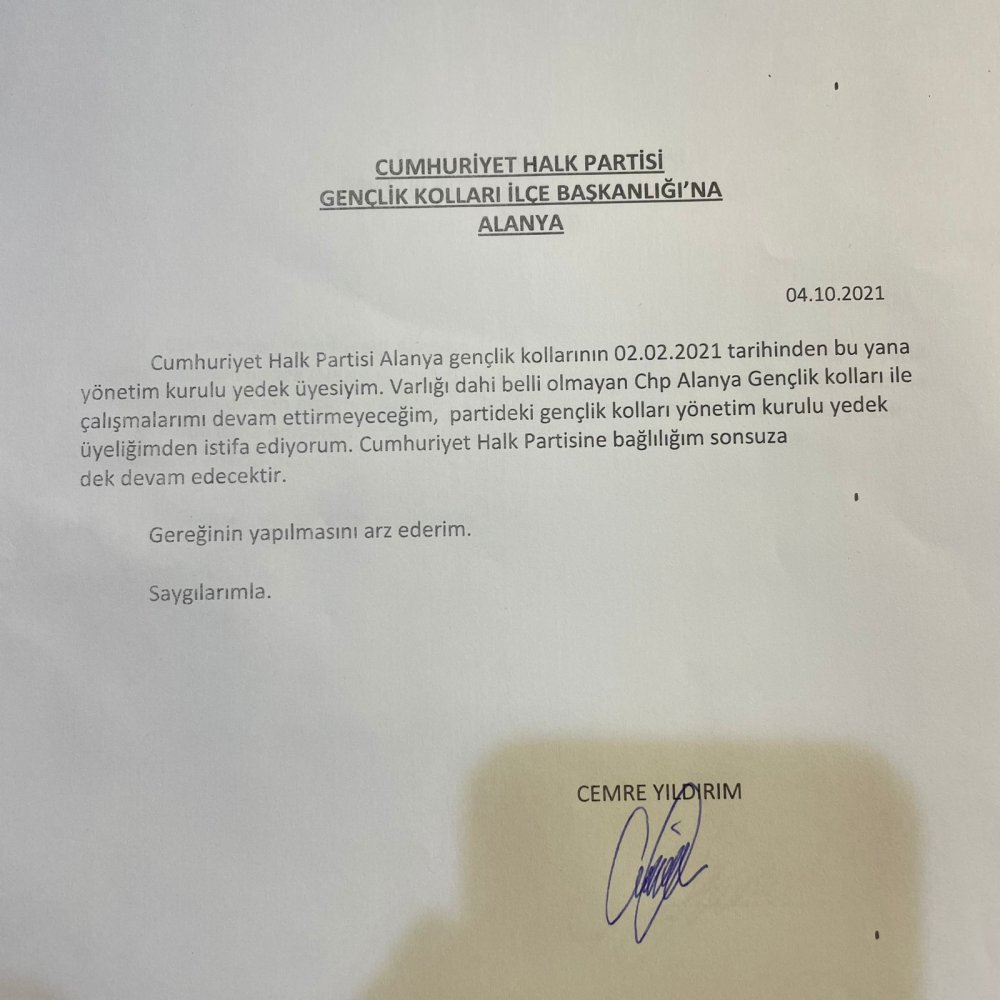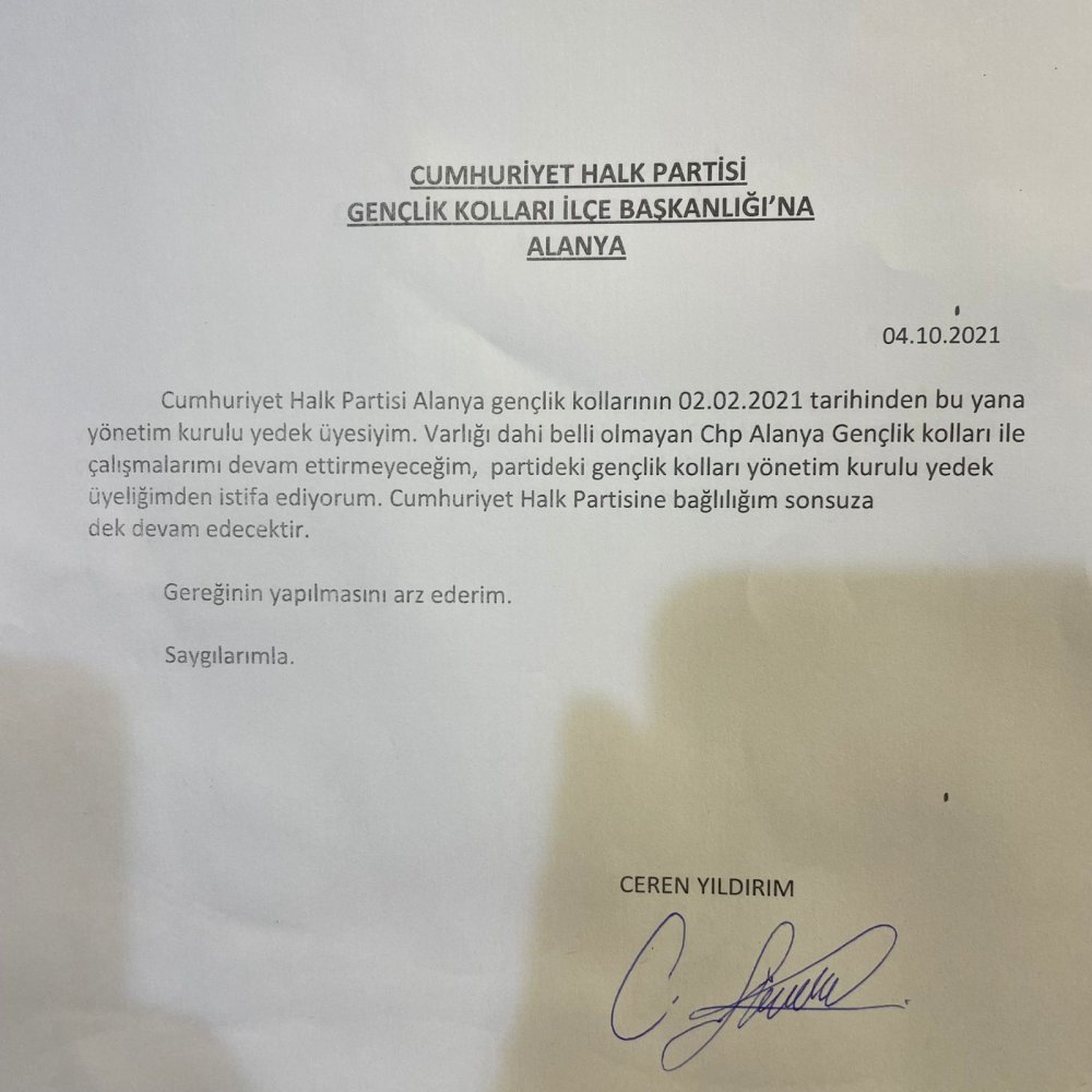 Cumhuriyet Halk Partisi (CHP) Alanya İlçe Teşkilatı Gençlik Kolları’nda yedek yönetim kurulu üyeleri Cemre ve Ceren Yıldırım isimli kardeşler ıslak imzalı istifa dilekçelerini imzalayıp CHP İl Yönetimine mail yoluyla gönderdikten 1 gün sonra Gençlik Kolları Yönetiminin ısrarı üzerine çark ederek istifa etmekten vazgeçti.