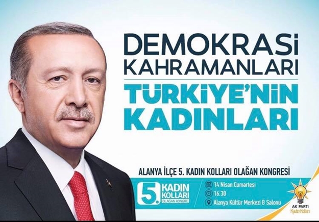 Adalet ve Kalkınma Partisi (AK Parti) Alanya İlçe Teşkilatı 5. Olağan Kadın Kolları Kogresi 14 Nisan (Yarın) Cumartesi günü gerçekleştirilecek. Alanya Kültür Merkezinde gerçekleştirilecek olan kongre 16.30'da başlayacak.
