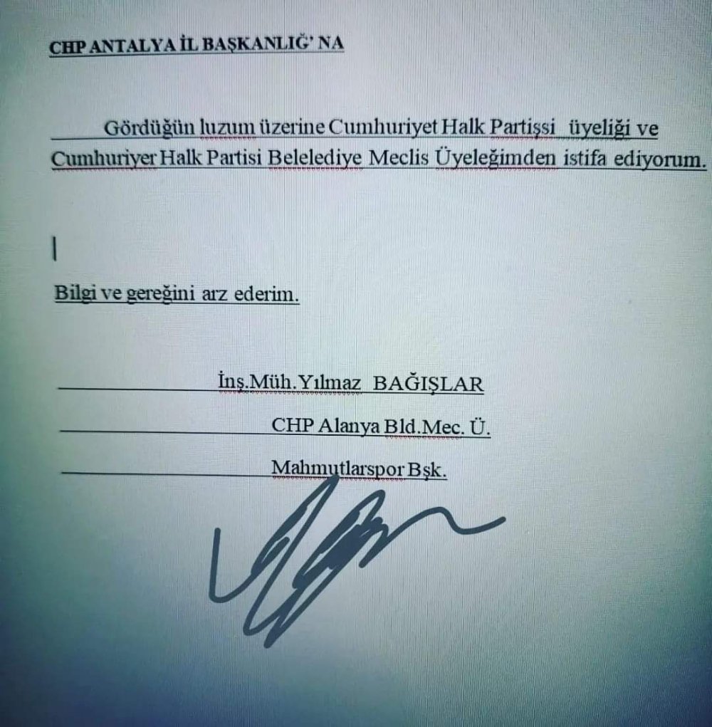 Alanya Belediye Meclis Üyesi, aynı zamanda Mahmutlarspor Başkanı olan, CHP’li İnşaat Mühendisi Yılmaz Bağışlar, dün gece şok bir kararla CHP’den istifa etti. Bağışlar hem CHP’den hem de meclis üyeliğinden istifa ettiğini belirtti.