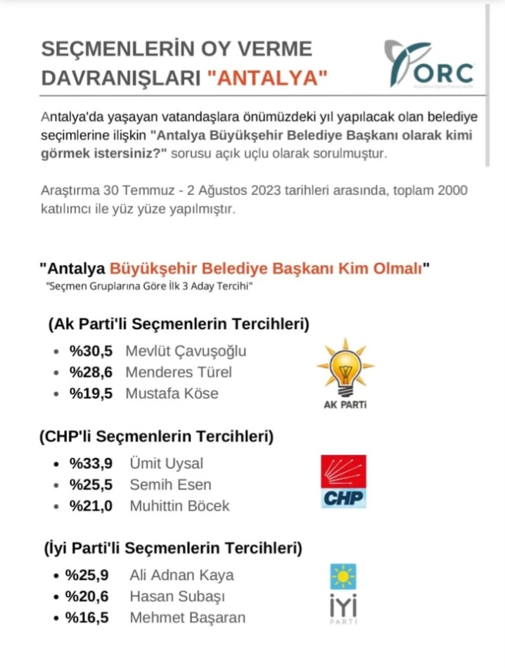 ORC Araştırma şirketi tarafından 30 Temmuz-2 Ağustos tarihleri arasında toplam 2 bin katılımcı ile yüz yüze yapılan kamuoyu yoklamasında her partinin seçmenine “Antalya Büyükşehir Belediyesi Başkanı olarak kimi görmek istersiniz?” diye soruldu. Ak Parti’li seçmenlerin yüzde 30,5’i Mevlüt Çavuşoğlu’nu, CHP’li seçmenlerin yüzde 33,9’ı Ümit Uysal’ı, İyi Parti’li seçmenlerin yüzde 25,9’u Ali Adnan Kaya’nın adını verdi.