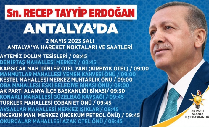 Cumhurbaşkanı Recep Tayyip Erdoğan’ın Antalya mitingi için 2 Mayıs Salı günü Alanya’da belirlenen noktalardan otobüs kaldırılacak. İşte o noktalar;
