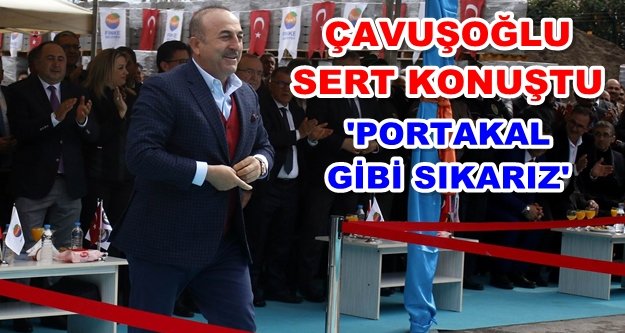 "Bu millet yeri geldiği zaman tüm dünyaya kafa tutmasını bilir" diyen Çavuşoğlu, "Kim olursa olsun, karşımızda kimin olduğu önemli değil. Haklı olduğumuz yerde biz hiçbir engeli tanımayız. Kimsenin karşısında boyun eğmeyiz. Karşımıza çıkanları ezer geçeriz, onların hepsini Finike portakalı gibi sıkar geçeriz. Tıpkı bugün yaptığımız gibi. Masaya gelmek isteyeni masaya çekeriz, hainlik edeni de toprağa gömeriz. Afrin’e de Fırat Kalkanı bölgesine de gömeriz. DAEŞ, YPG, PKK, FETÖ’ymüş hiç bizi ilgilendirmez. FETÖ’nün de nerede olursa olsun olsun peşindeyiz. 15 Temmuz hain darbe girişimi ve bu acıyı bize yaşatacak olanlara da hesap soracağımıza dair milletimize sözümüz var. Askerimize, polisimize, jandarmamıza güvenin. Bizlere güvenin, milli duruş sergileyen tüm siyasilerimize güvenin, Devlet Bahçeli’ye güvenin, Recep Tayyip Erdoğan’a güvenin, Binali Yıldırım’a güvenin, bizlere güvenin. Biz milli duruş sergileyerek, bir taraftan ülkemizi büyütmek için çalışıyoruz, bir taraftan da karşımıza çıkan engelleri bertaraf etmek için kararlılıkla yolumuzda yürüyoruz" dedi.