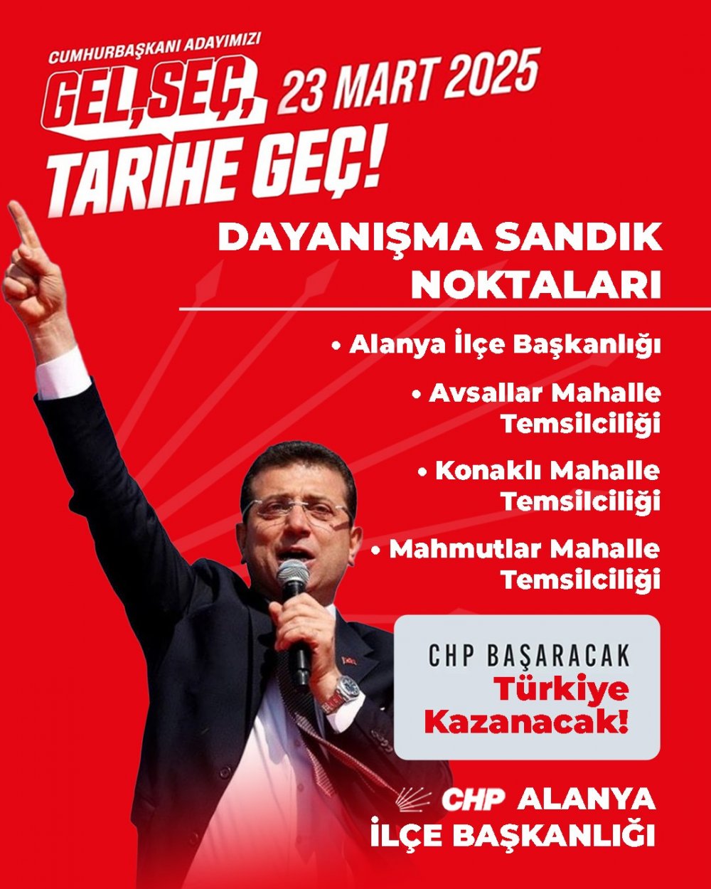 Cumhuriyet Halk Partisi (CHP), yarın yapılacak olan ön seçim için Alanya halkına katılım çağrısında bulundu. Parti afişlerinde “Kurtuluş yok tek başına, ya hep beraber ya hiçbirimiz” sloganlarına yer verildi.