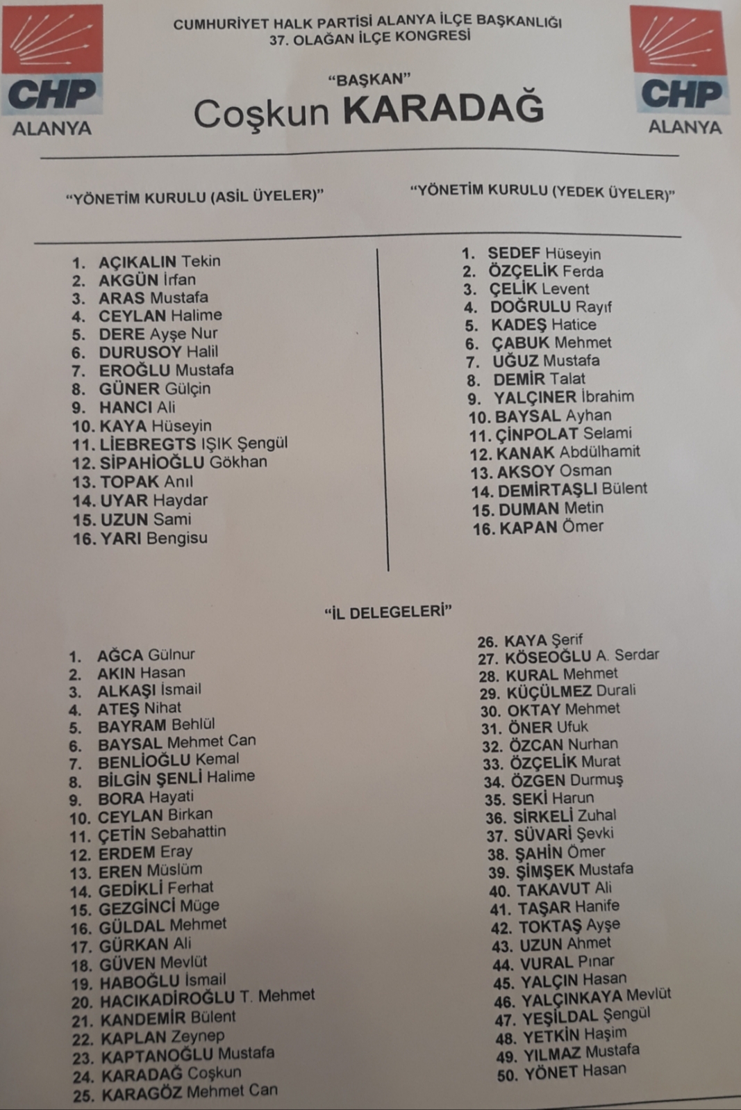 Alanya Kültür Merkezi'nde (AKM) 37.'si gerçekleşen genel kurulda saat 17.00 itibariyle oylama bitti ve sandıkların kapanmasının ardından oy sayımına geçildi. Mevcut başkan Coşkun Karadağ, eski başkan Sefa Çorbacı ve Ömer Zavlak olmak üzere 3 başkan adayının yarıştığı seçimlerde CHP Alanya’nın yeni başkanı Coşkun Karadağ seçildi. Yapılan oylamada Ömer Zavlak 116 oy, Coşkun Karadağ 151 oy, Sefa Çorbacı 85 aldı.