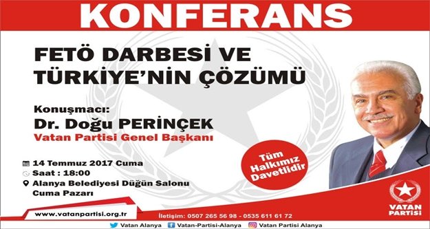 Baştan beri turizm ve tarımsal üretim merkezi olan bölgemiz sorunlarına çözüm üreten Vatan Partisi ve Genel Başkanımız Doğu Perinçek Alanya’mız da olacak. Bütün bu sorunlarımızı, bu kuşatmaya Türk Milleti olarak nasıl yaracağımızı, düzlüğe nasıl çıkacağımızı, bölge ülkeleri ile birliğimiz için son gelişmeleri değerlendirme kapsamında resmi davet üzerine bulunduğu İran dönüşü davetimiz üzerine 13-14 Temmuz günleri Alanya’da olacaktır. Değişik etkinliklerde vatandaşlarımızla görüşecek ve kuşatmadan çıkış yolları konusundaki düşüncelerini paylaşacaktır. Değerli Alanya halkının bilgisine sunarız saygılarımızla