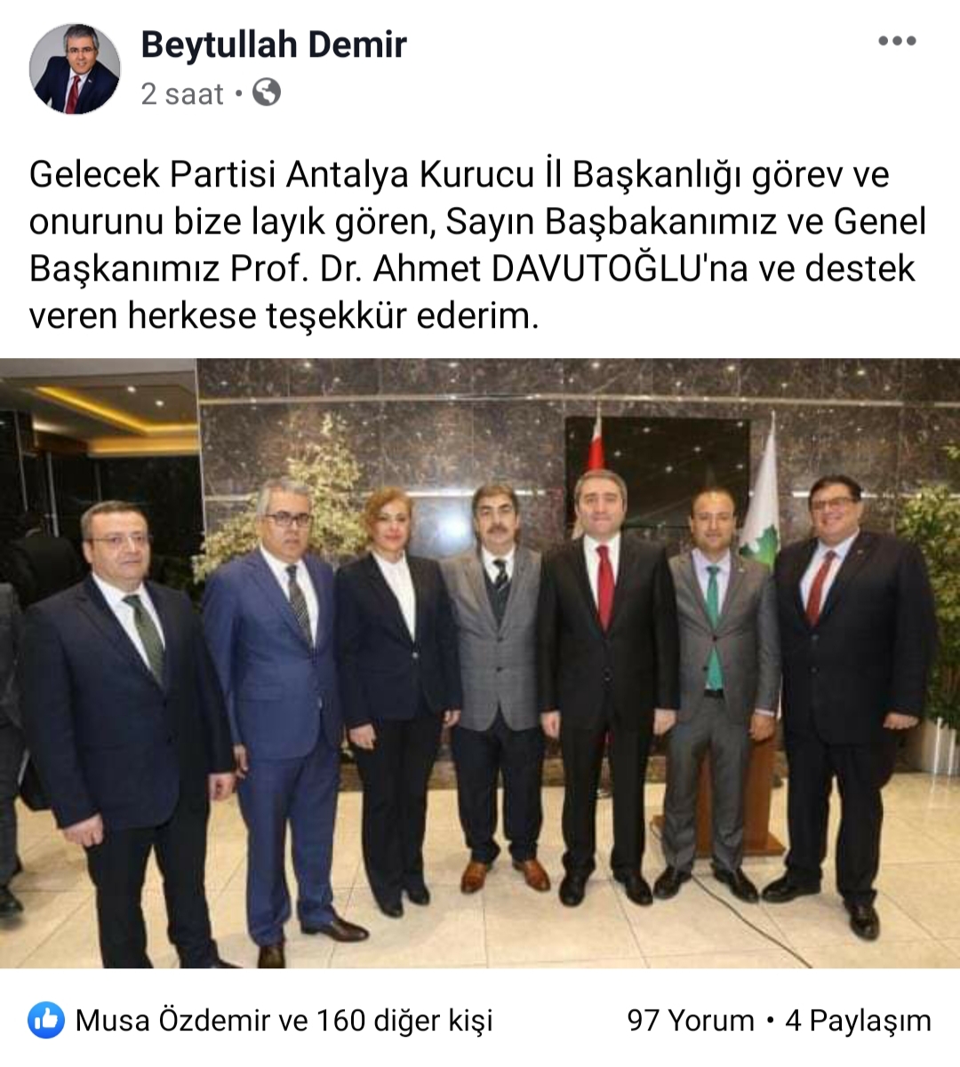 Gelecek Partisi Antalya İl Başkanı'nın Beytullah Demir olduğu öğrenildi. Sosyal medya üzerinden il başkanı olduğunu açıklayan Demir, "Gelecek Partisi Antalya İl Kurucu Başkanlığı görev ve onurunu bize layık gören, Sayın Başbakanımız ve Genel Başkanımız Prof. Dr. Ahmet DAVUTOĞLU'na ve destek veren herkese teşekkür ederim" dedi.