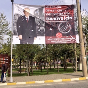 Kapı kapı dolaşarak referandumda vatandaşlardan destek isteyen MHP İlçe Teşkilatı, Alanya'nın pek çok bölgesine dev afişler astırdı. Afişlerde özellikle 'Devlet Bahçeli' ve 'evet' vurgusu yapıldı. Ayrıca afişlerde "Hakimiyet Allah'ın, Egemenlik Milletindir. Teminatı Devlettir" ve "Millet İçin, Devlet İçin, Cumhuriyet İçin, Türkiye İçin; Evet" gibi sloganlar da yer aldı. Özellikle parti binasının önüne asılan devasa büyüklükteki afiş partililer tarafından büyük beğeni topladı. Nazilli'yi unutmadılar