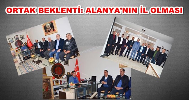 Türkdoğan'ın bugün ki son ziyaretçisi Alanya Ziraat Odası Başkanı Turgut Musluoğlu ve yönetimi oldu. Musluoğlu ve yönetimi Türkdoğan ile çiftçilerin sorunlarını görüştüler. Bu görüşmede ki en önemli detay ise Alanya'nın il olma isteğiydi. MHP Lideri Devlet Bahçeli'nin Alanya ziyaretinde yaptığı il çıkışı için teşekkür eden Musluoğlu ve ekibi Alanya'nın il olmasının çifçilere büyük katkı sağlayacağını söyledi. Türkdoğan'da 'Alanya'nın il olması hepimizin ortak beklentisi' dedi.