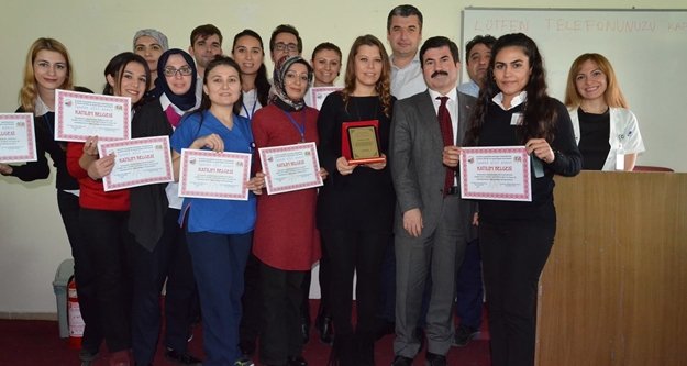 Eğitime katılan sağlık çalışanlarına sertifikaları takdim edildikten sonra, Özel Eğitim Alanı Öğretmeni Burcu Candan’a teşekkür amaçlı Başhekim Dr. Tevfik Yazan tarafından plaket verildi.