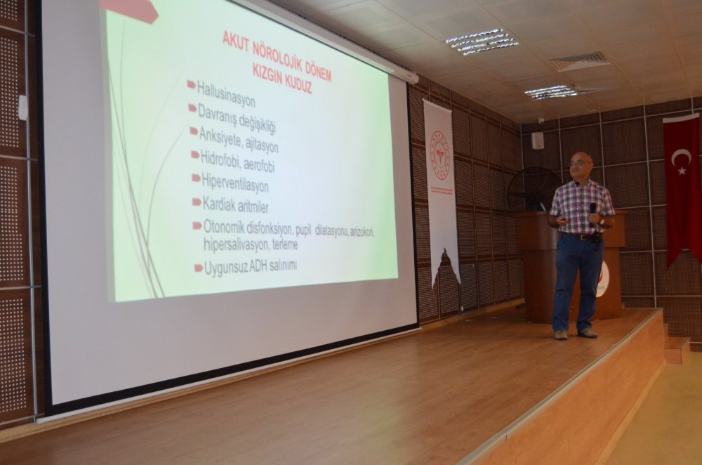 Alanya Eğitim ve Araştırma Hastanesi konferans salonunda gerçekleşen eğitimde, Akdeniz Üniversitesi Tıp Fakültesi Enfeksiyon Hastalıkları ve Klinik Mikrobiyoloji Anabilim Dalı Öğretim Üyesi Prof. Dr. Ata Nevzat Yalçın ve Antalya İl Sağlık Müdürlüğü Bulaşıcı Hastalıklar Biriminden Veteriner Hekim Ethem Örge katılımcılara; modül girişi, kuduz aşılama süreci, kuduz riskli temas sonrası profilaksi (hastalık meydana gelmeden hastalığın önlenmesi ) yaklaşımı , temas öncesi profilaksi önerileri, hastalığa ilişkin genel bilgiler, hastalıktan şüphelenilmesi durumunda yapılacaklar hakkında bilgi verdi. Kuduz hastalığının halk sağlığına tehdit oluşturan eski çağlardan beri bilinen en önemli enfeksiyon olduğuna dikkati çeken Prof. Dr. Ata Nevzat Yalçın, “Aşı ile önlenebilecek bir viral hastalık olan kuduz sebebiyle dünyada her yıl tahminen 59 bin insan hayatını kaybetmektedir. Kuduz şüpheli hayvan ile temasta yara yerine yapılacak ilk yardım girişimleri konusunda Dünya Sağlık Örgütü’nün önerisi en az 15 dakika su ve sabunla yıkanması, deterjan, iyot bileşiği ya da virüs öldürücü etkisi olan bir maddenin yarada kullanılmasıdır. Bu tanımlayıcı çalışma kuduz şüpheli hayvan ile temas sonrası yapılan ilk yardım girişimlerini belirlemek amacı ile yapılmıştır.” dedi.