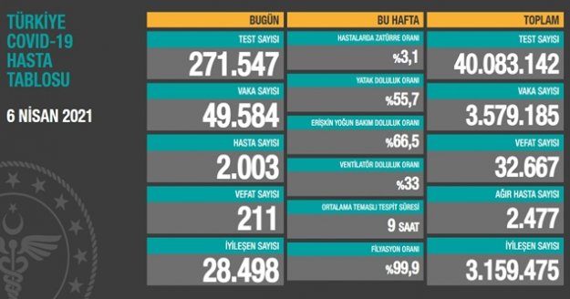 Sağlık Bakanlığının Covid-19 bilgilendirme sayfasında Türkiye'nin güncel korona virüs tablosu kamuoyuyla paylaşıldı. Tabloya göre son 24 saatte 211 kişi korona virüsten hayatını kaybetti, toplam can kaybı 32 bin 667'a yükseldi. Toplamda 40 milyon 83 bin 142 test yapıldı. Bugün yapılan 271 bin 547 testten, 49 bin 584 yeni vaka sayısı, 2 bin 3 kişi de yeni hasta sayısı olduğu belirtildi. Toplam vaka sayısının 3 milyon 579 bin 185 olduğu, bugün iyileşen 28 bin 498 kişiyle birlikte toplam iyileşen hasta sayısının 3 milyon 159 bin 475'e yükseldiği, toplam hastalarda zatürre oranının yüzde 3,1, ağır hasta sayısının ise 2 bin 477 olduğu açıklandı.
