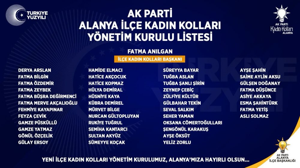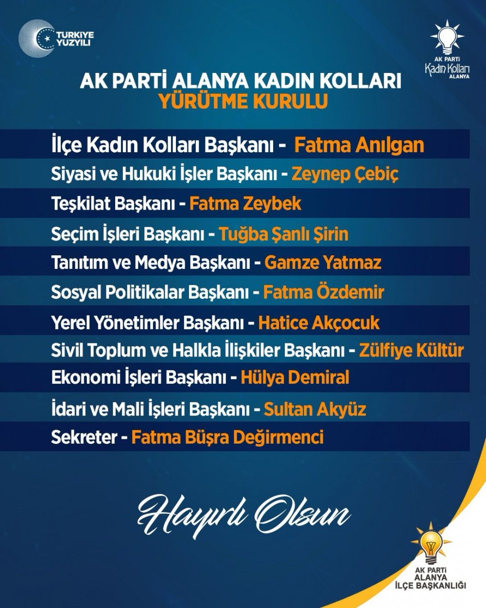 AK Parti Alanya İlçe Kadın Kolları Yönetim Kurulu Listesi açıklandı.