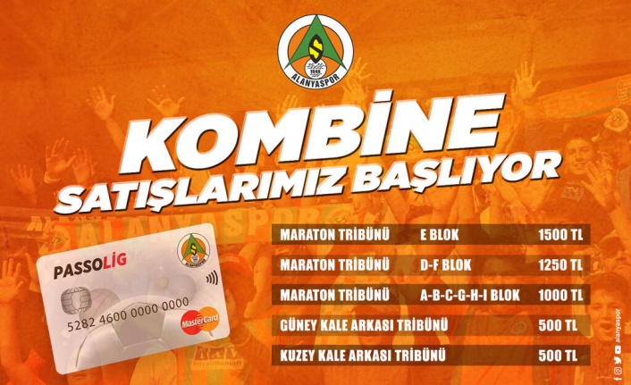 Kombine satışı, bugün saat 10.00'dan itibaren genel satışa açılacak ve satın alma işlemleri www.passo.com.tr ve Passo Mobil uygulama üzerinden devam edecek. Ayrıca 1 Temmuz Cuma gününden itibaren Aytemiz Alanyaspor Passolig Ofisi de hizmet vermeye başlayacak. Aytemiz Alanyaspor Passolig Kartı olan taraftarların, E-Bilet kullanım süresini 31 Mayıs 2023’e kadar uzatması gerekiyor. Alınacak her koltuk için passolig kartı zorunlu olurken, kişi başı kombine satın alma limiti ise 5 olarak belirlendi.