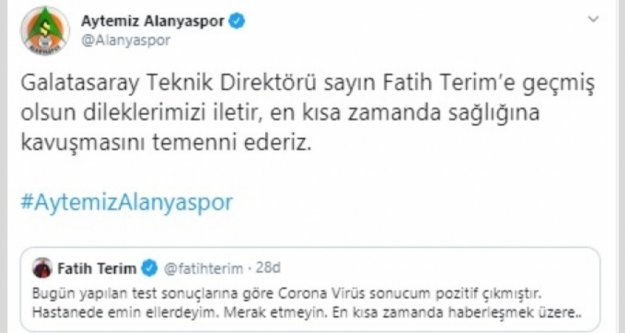 Süper Lig temsilcimiz Aytemiz Alanyaspor, koronavirüs testi pozitif çıkan Fatih Terim'e geçmiş olsun mesajı yayınladı