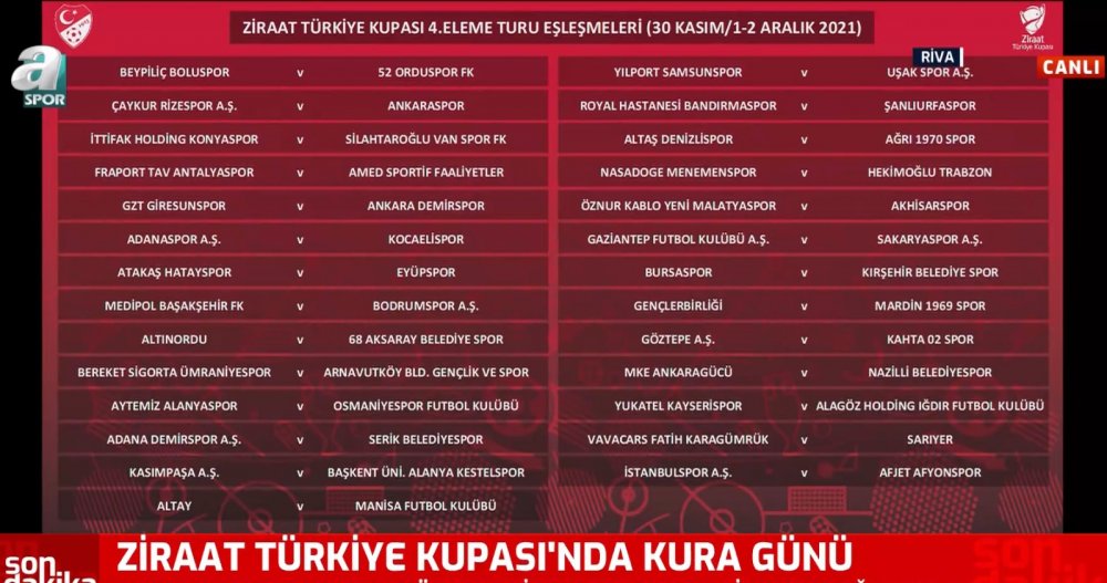 Ziraat Türkiye Kupası 4. Eleme Turu Kura Çekimi, TFF Riva Hasan Doğan Milli Takımlar Kamp ve Eğitim Tesisleri'nde yapıldı. Orhan Saka Konferans Salonunda gerçekleşecek kura çekimi törenine, Federasyon yetkilileri ve kulüp temsilcileri, Aytemiz Alanyaspor adına Berke Çelebi, BÜA Kestelspor adına da Onur Parlak katıldı. Kura Çekilişine katılan 54 takımın eşleşmeleri belirlendi maçlar seri başı takımların sahasında oynanacak. Tek maç eleme usulüne ve seri başı sistemine göre oynanacak Ziraat Türkiye Kupası 4. Eleme Turu müsabakaları; 30 Kasım, 1-2 Aralık tarihlerinde yapılacak.