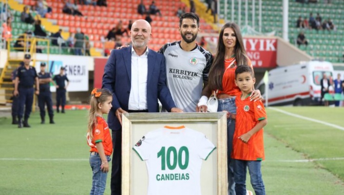 Alanyaspor’un Portekizli kanat oyuncusu Daniel Candeias, Kasımpaşa maçında turuncu yeşilli forma ile 100’ncü maçına çıktı. Kulüp tarafından hazırlanan imzalı Alanyaspor forması, Kasımpaşa maçı öncesi 35 yaşındaki tecrübeli oyuncuya başkan Hasan Çavuşoğlu hediye günün anısına hediye etti.